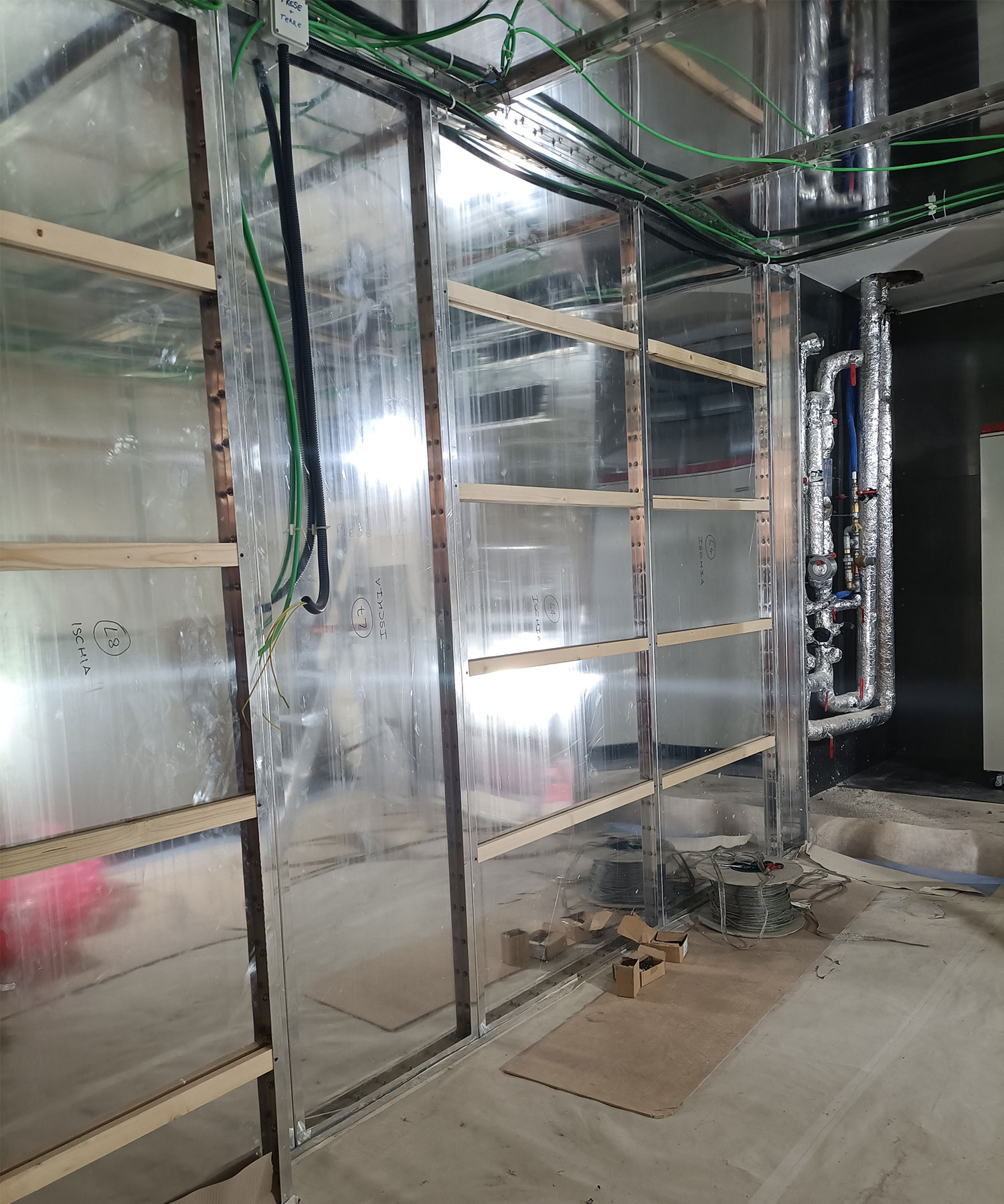 La sala in cui sarà collocato il sistema RM sarà poi rivestita con pannelli autoportanti in alluminio, imbullonati tra loro.